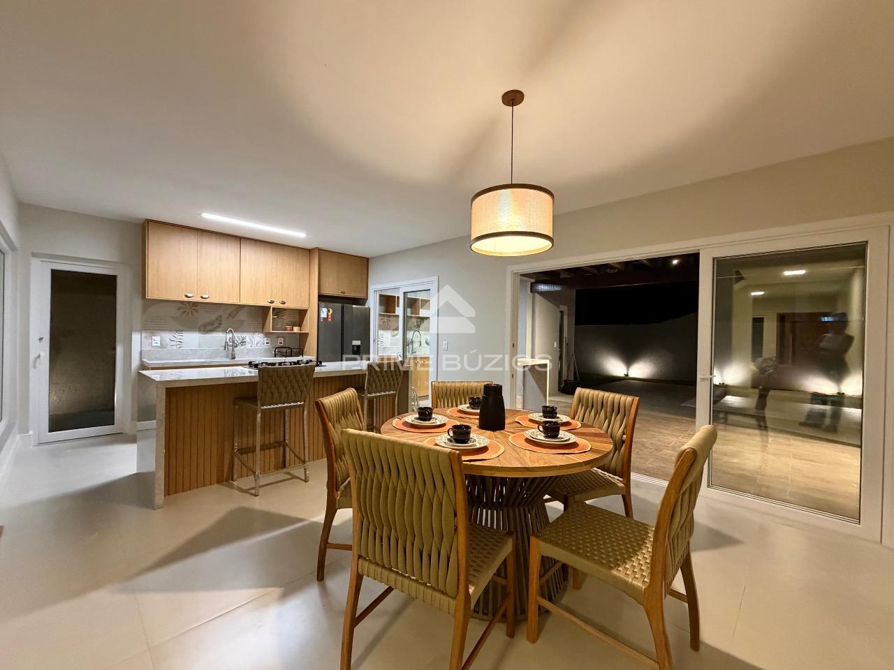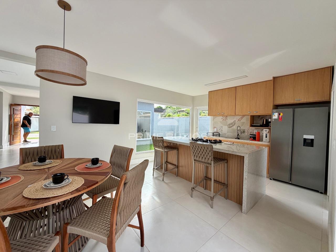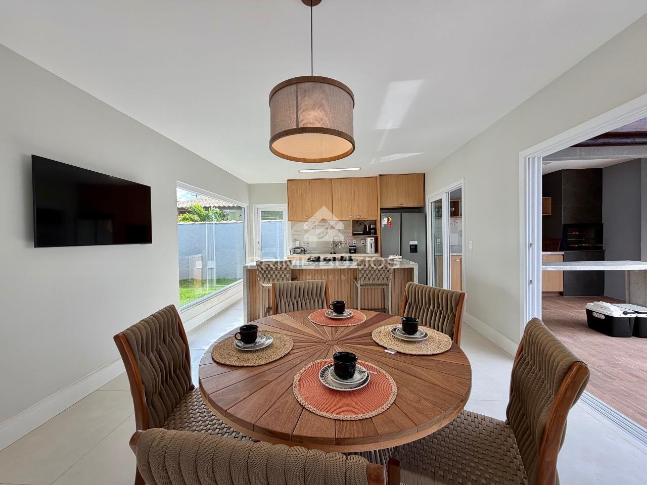 Casa com 4 suítes, dividida em dois pavimentos, com 200m² de área construída, um exemplo de sofisticação e conforto. No primeiro andar, ao entrar, você é recebido por uma ampla sala de estar, perfeita para momentos de lazer e convivência. A sala de jantar, adjacente à cozinha, proporciona um ambiente ideal para refeições em família ou com amigos. A cozinha é equipada possui uma ilha central e integração com a área gourmet.